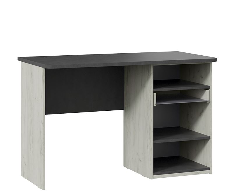 Письменный стол с тумбой создает полноценное место для учебы и занятий. Конструкция тумбы включает в себя открытую полку, выдвижной ящик и закрытые полки.