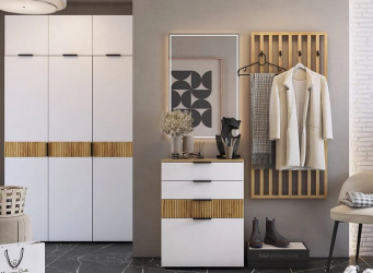Что же включает набор мебели для прихожей? Как правило, это вертикальный высокий шкаф-пенал, открытые крючки для верхней одежды и тремплей на вертикальных ламелях, полки для аксессуаров. Дополнительно предусмотрены полки, калошницы, выдвигающиеся шкафы.