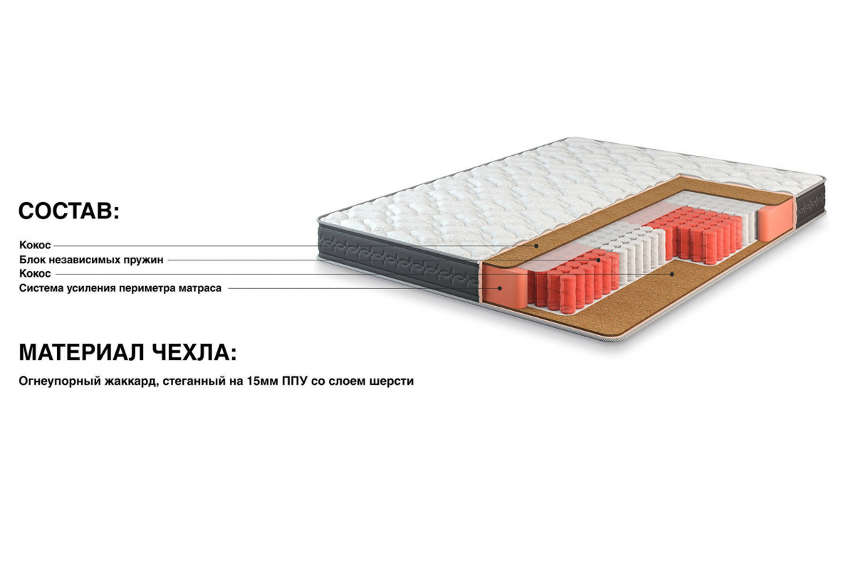 Классический матрас на основе блока независимых пружин обладает средней жесткостью и хорошей поддержкой позвоночника. Прекрасно вентилируется, благодаря двум слоям натуральной кокосовой койры. Блок пружин защищается термопресованным волокном, на которое с обеих сторон блока кладется латексированный кокос, придающий матрасу необходимую жесткость и равномерно распределяющий давление. Чехол матраса выполнен из плотного жаккарда, не поддерживающего горение, который стегается на 15 мм пене и слое синтепона плотностью 500 гр/м2. Данное сочетание придает матрасу необходимую мягкость и комфорт.