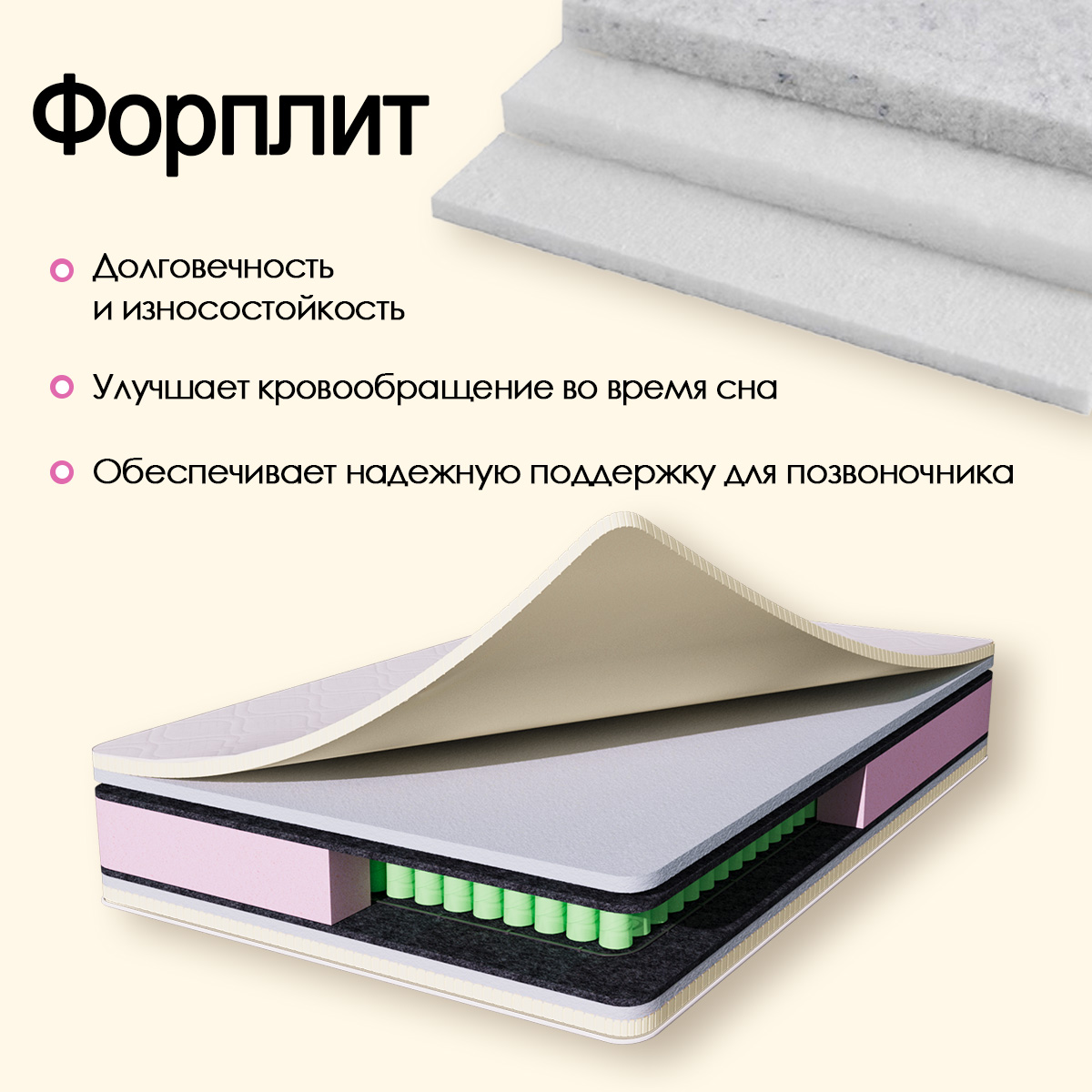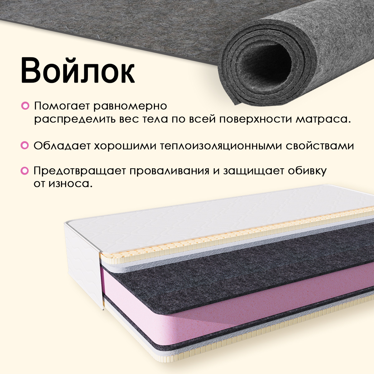 Блок независимых пружин,повышенной надежности.Латекс.Форплит.Войлок.Чехол стеганный на синтепоне.