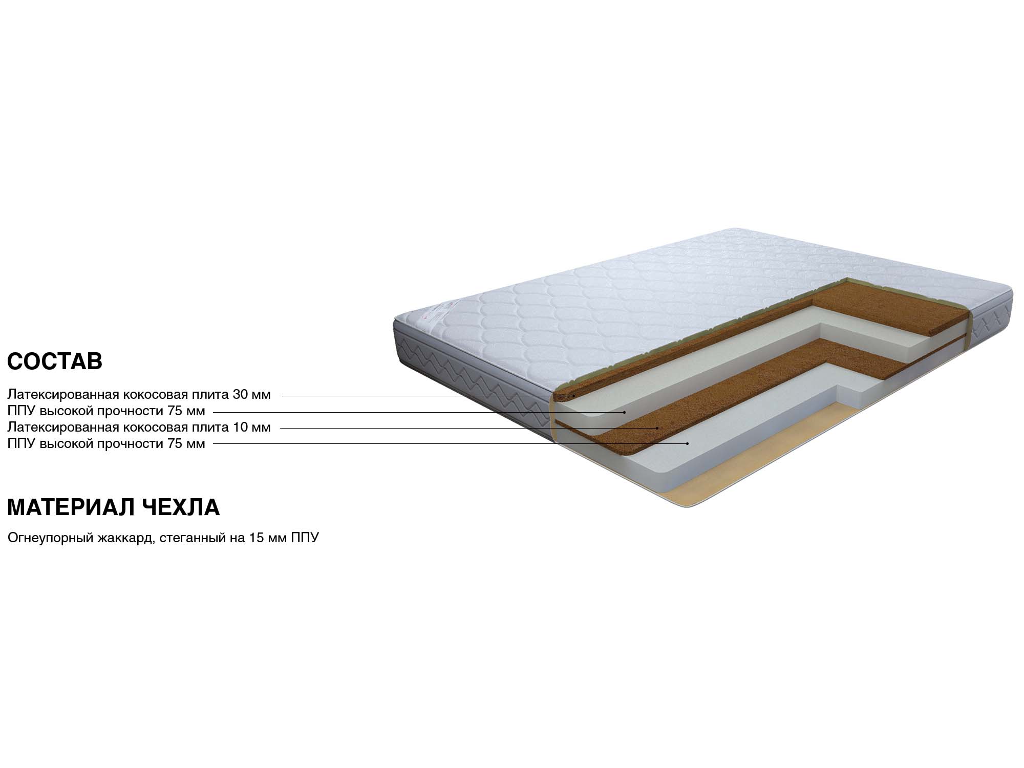 латексированный кокосовый мат 3 см, ортопена 7.5 см, латексированный кокосовый лист 1 см, ортопена 7