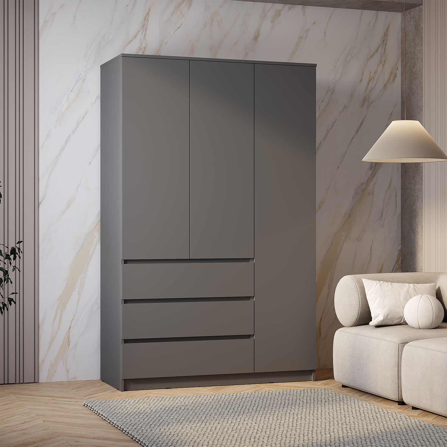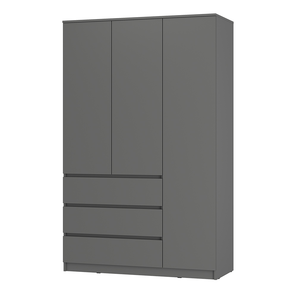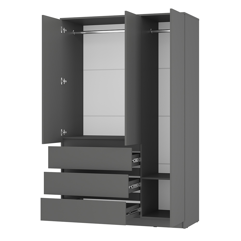 Шкаф «Симпл» — это воплощение строгого минимализма и продуманной функциональности. Модель в глубоком оттенке «графит» станет стильным акцентом спальни, гостиной или прихожей. Внутреннее пространство организовано для максимального удобства: три просторных выдвижных ящика на шариковых направляющих и два отсека со штангой для вертикального хранения одежды. При необходимости штанги можно заменить на полки ПЛ-06 и ПЛ-07, адаптируя шкаф под свои задачи. Интегрированные ручки (срез на фасадах) подчеркивают лаконичность дизайна.